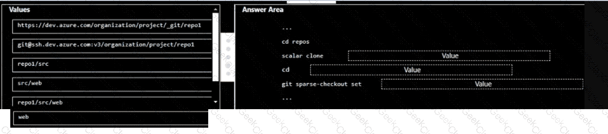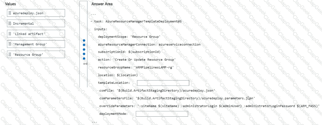 How should you configure the pipeline task? To answer, drag the appropriate values to the correct targets. Each value may be used once, more than once, or not at all. You may need to drag the split bar between panes or scroll to view content.