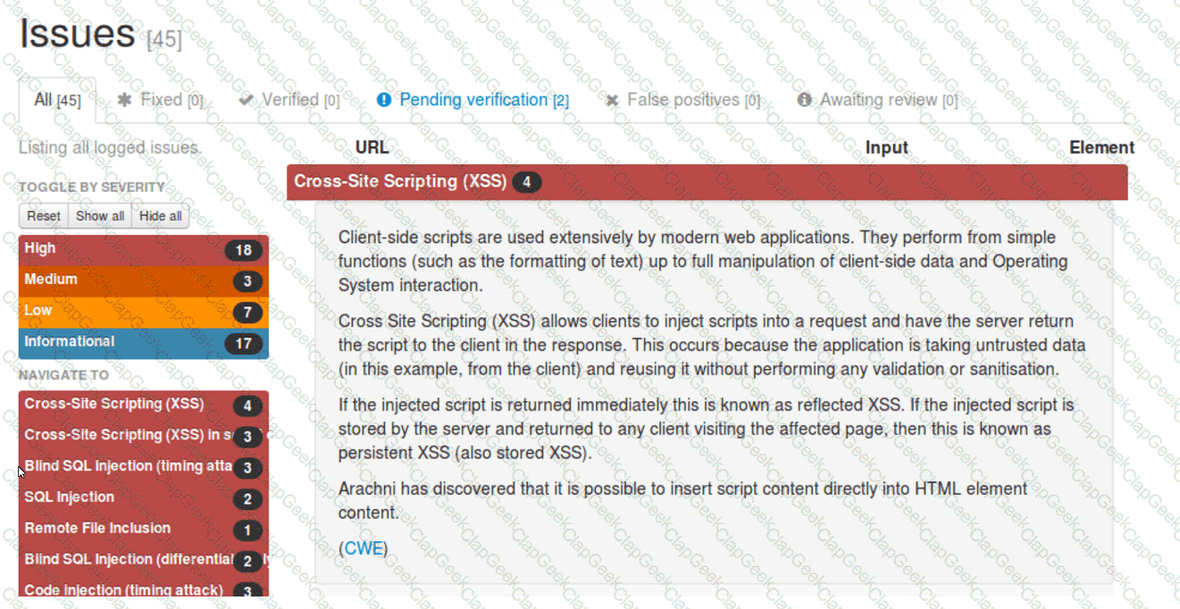 A security analyst recently used Arachni to perform a vulnerability assessment of a newly developed web application. The analyst is concerned about the following output: