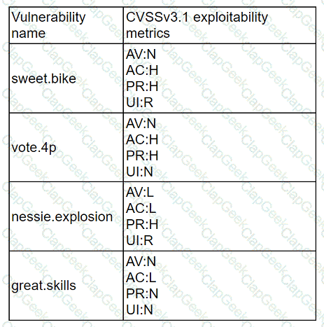 A company recently removed administrator rights from all of its end user workstations. An analyst uses CVSSv3.1 exploitability metrics to prioritize the vulnerabilities for the workstations and produces the following information: