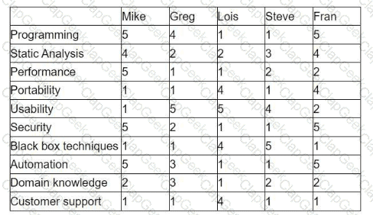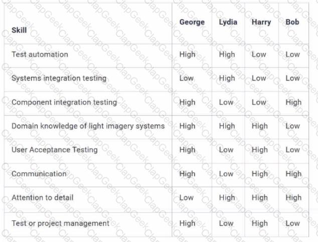 Refer to SCENARIO 2 - You have been tasked with recruiting testers for Project 3 to help design and run regression tests, you have been provided with a skills matrix for four prospective candidates. The matrix shows the skill level (High or Low) for each candidate: