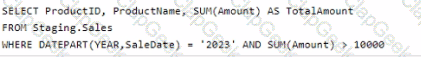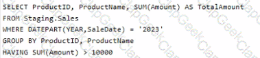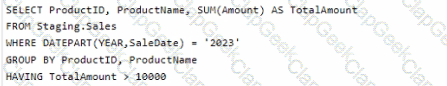 You need to write a T-SQL query that will return data for the year 2023 that displays ProductID and ProductName arxl has a summarized Amount that is higher than 10,000. Which query should you use?