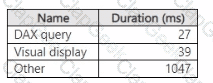 You open Performance analyzer and identify that a visual named Orders By Date is the slowest to render. The duration breakdown for Orders By Date is shown in the following table.