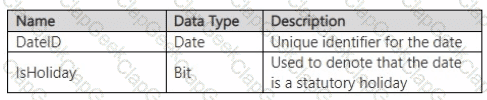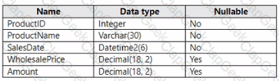 You have a Fabric warehouse that contains a table named Staging.Sales. Staging.Sales contains the following columns.