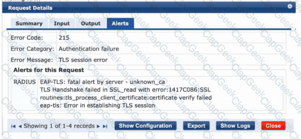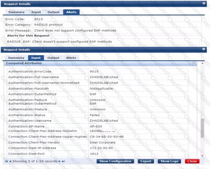 You configured a mixed-mode SSID with WPA3-Enterprise and EAP-TLS security. When you connect a client, HPE Aruba Networking ClearPass shows the following error: