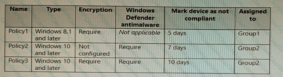 In Microsoft Intune, you have the device compliance policies shown in the following table.