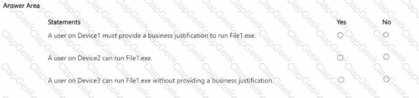 • Assignments: Group1 Each device contains a file named File1.exe that can be run only by an administrator. You create an EPM elevation rules policy named ElevattonRules1 that has the following settings: