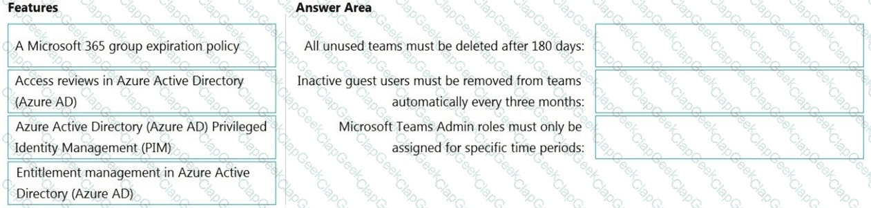 Which feature should you use for each requirement? To answer, drag the appropriate features to the correct requirements. Each feature may be used once, more than once, or not at all. You may need to drag the split bar between panes or scroll to view content.
