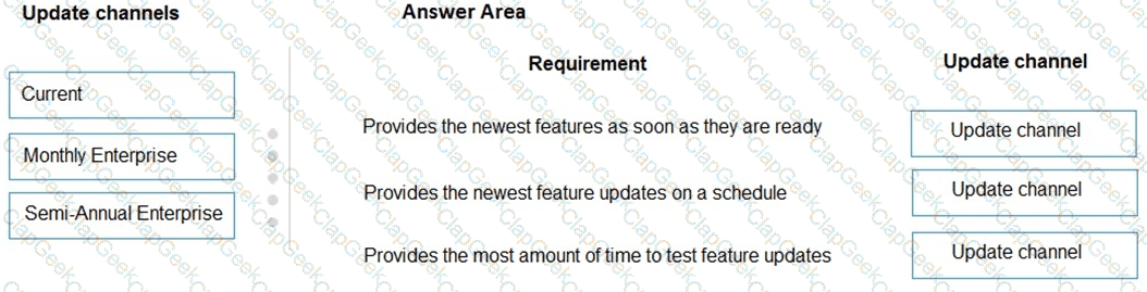 Which update channel should you use for each requirement? To answer, drag the appropriate update channels to the correct requirements. Each update channel may be used once, more than once, or not at all. You may need to drag the split barbetween panes or scroll to view content.
