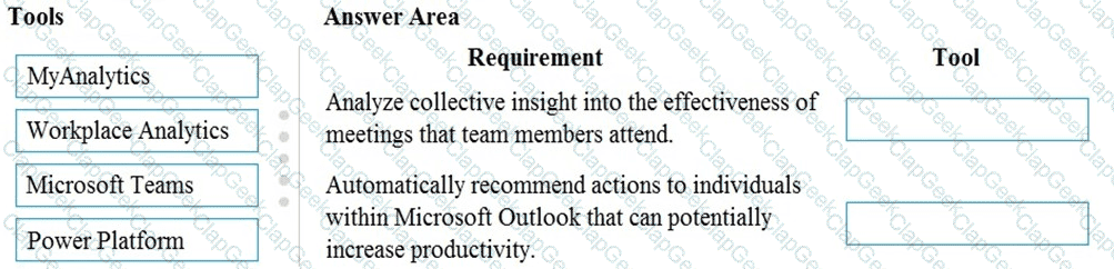 Which tool should you identifyfor each requirement? To answer, drag the appropriate tools to the correct requirements. Each tool may be used once, more than once, or not at all. You may need to drag the split bar between panes or scroll to view content.