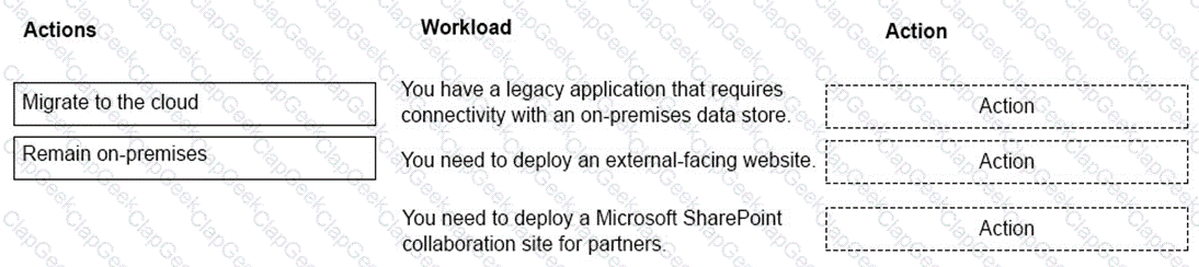 Which workloads you can migrate to the cloud? To answer, drag the appropriate actions to the correct workloads. Each action may be used once, more than once, or not at all. You may need todrag the split bar between panes or scroll to view content.