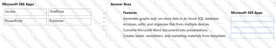 Which application should you use? To answer, drag the appropriate Microsoft 365 Apps applications to the correctfeatures. Each Microsoft 365 Apps application may be used once, more than once, or not at all. You may need to drag the split bar between panes or scroll to view content.