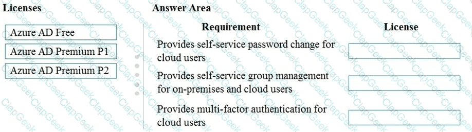 Match each Azure AD license toits requirement. To answer, drag the appropriate Azure AD license from the column on the left to its requirement on the right. Each Azure AD license may be used once, more than once, or not at all.