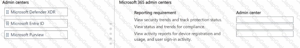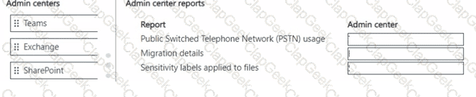 Which admin center should you use? To answer, move the appropriate admin center to the correct reporting requirement. You may use each admin center once, more than once, or not at all. You may need to move the split bar between panes or scroll to view content.