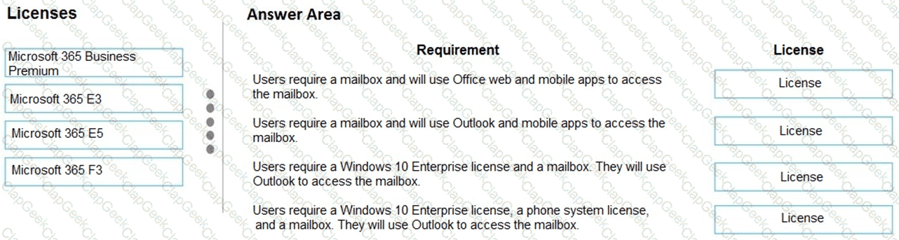 Match each licenseto its requirement. To answer, drag the appropriate license from the column on the left to its requirement on the right. Each license may be used once, more than once, or not at all.