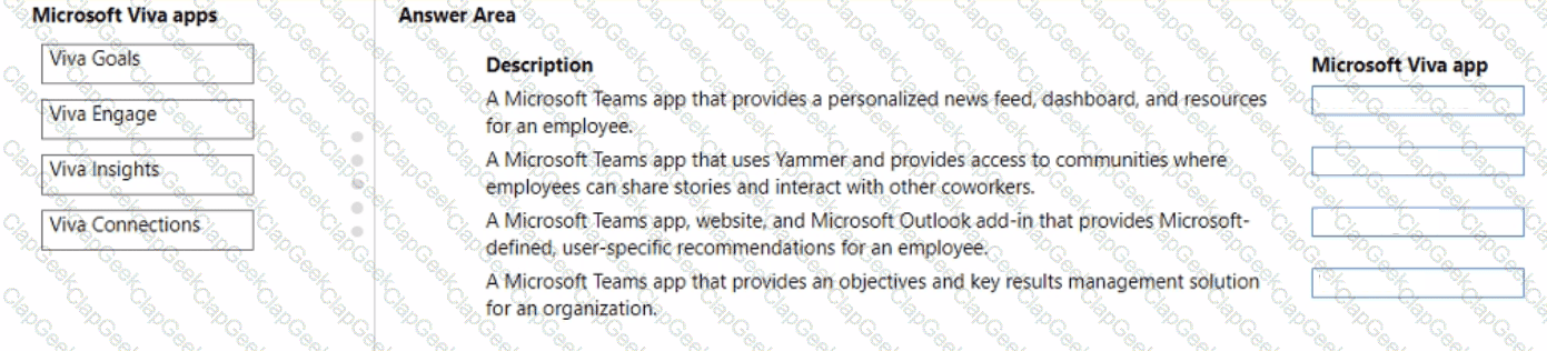 To answer, drag the appropriate Microsoft Viva app from the column on the left to its description on the right. Each Microsoft Viva app may be used once, more than once, or not at all.