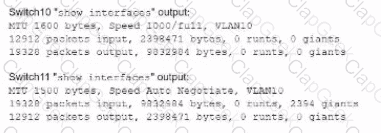 A network technician is troubleshooting network latency and has determined the issue to be occuring two network switches( Switch10 and Switch11). Symptoms reported included poor video performance and slow file copying. Given the following informtion: