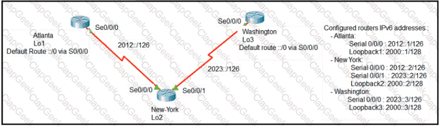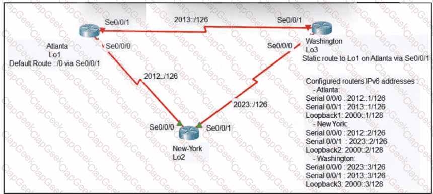 The loopback1 interface of the Atlanta router must reach the loopback3 interface of the Washington router. Which two static host routes must be configured on the NEW York router? (Choose two)