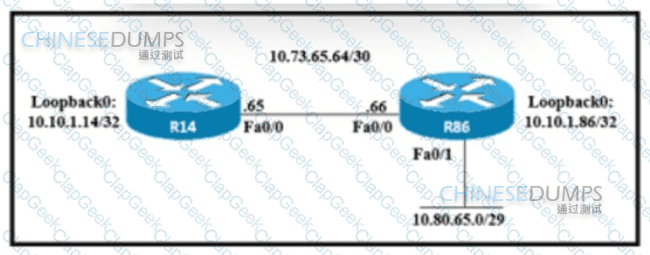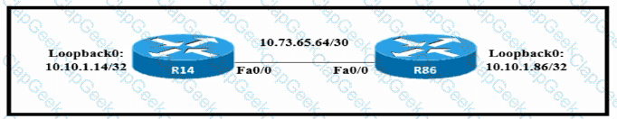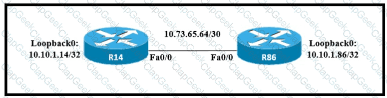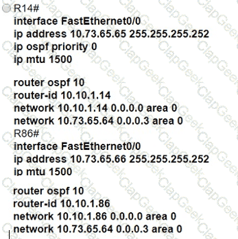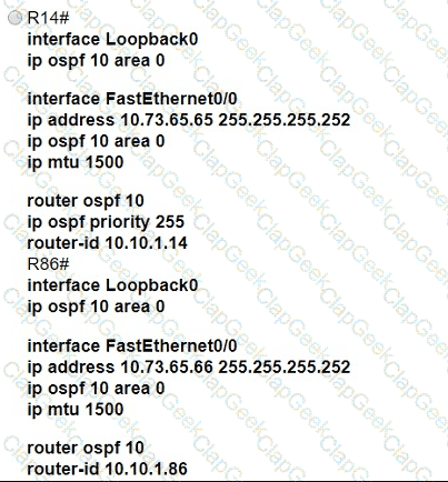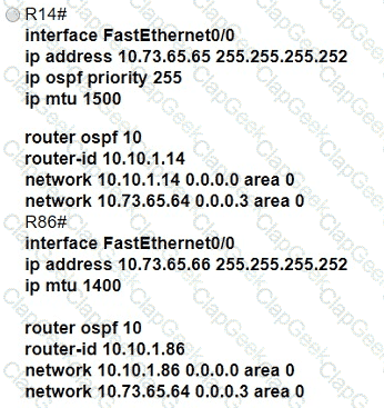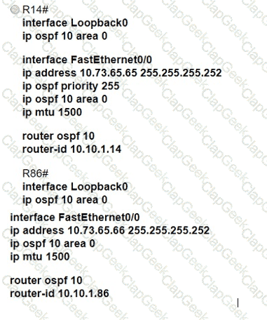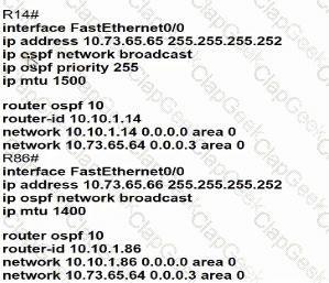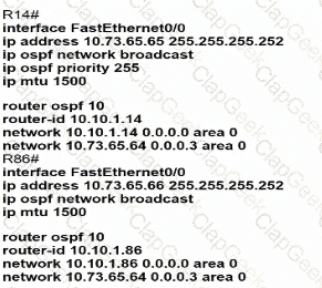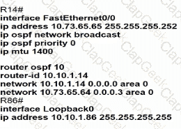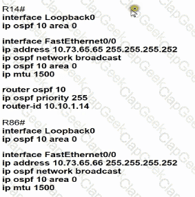 All interfaces are configured with duplex auto and ip ospf network broadcast. Which configuration allows routers R14 and R86 to form an OSPFv2 adjacency and act as a central point for exchanging OSPF information between routers?