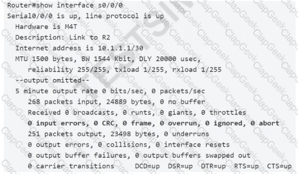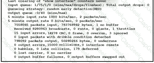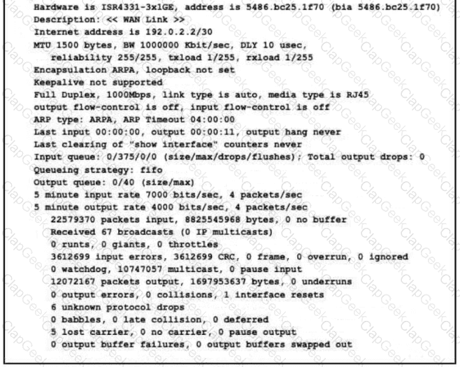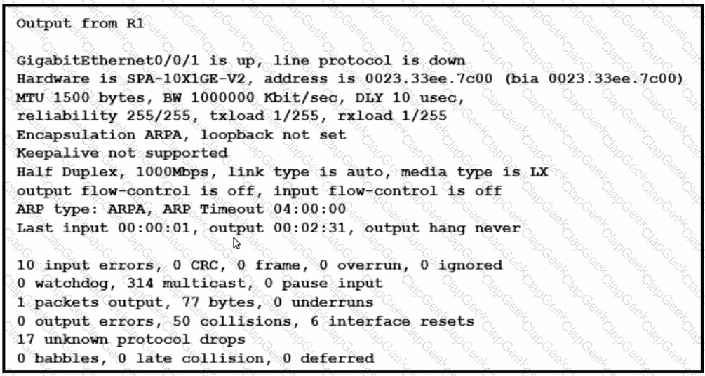 An administrator received a call from a branch office regarding poor application performance hosted at the headquarters. Ethernet 1 is connected between Router1 and the LAN switch. What identifies the issue?