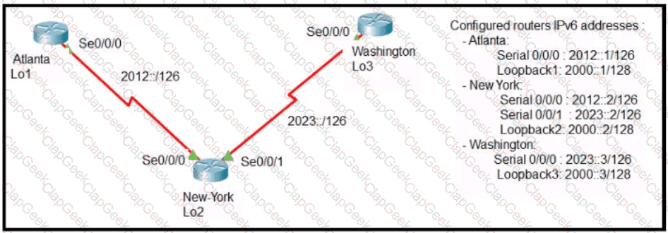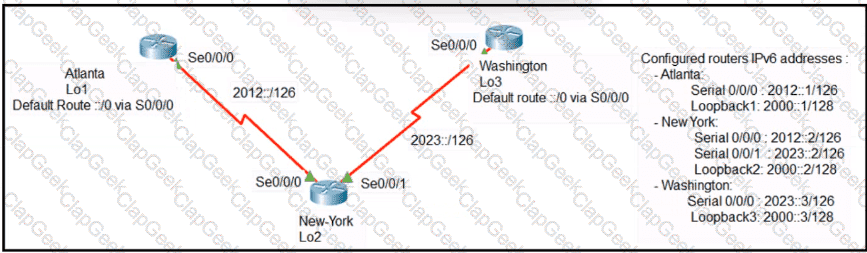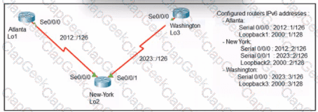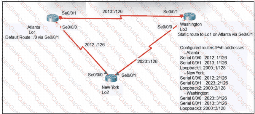 The New York router must be configured so that traffic to 2000::1 is sent primarily via the Atlanta site, with a secondary path via Washington that has an administrative distance of 2. Which two commands must be configured on the New York router? (Choose two.)