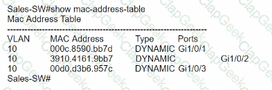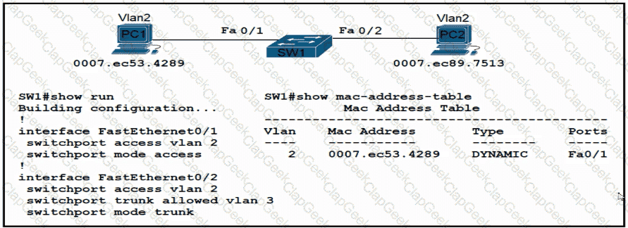 An engineer has started to configure replacement switch SW1. To verify part of the configuration, the engineer issued the commands as shown and noticed that the entry for PC2 is missing. Which change must be applied to SW1 so that PC1 and PC2 communicate normally?