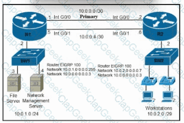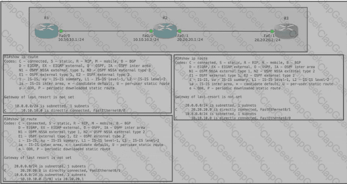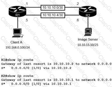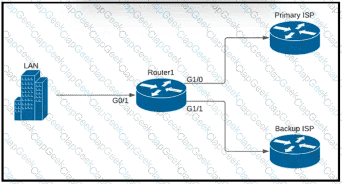 Refer to the exhibit. A secondary route is required on router R1 to pass traffic to the LAN network on R2 if the primary link fails. Which command must be entered to configure the router?