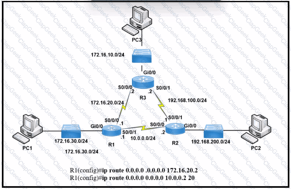 Router R1 currently is configured to use R3 as the primary route to the Internet, and the route uses the default administrative distance settings. A network engineer must configure R1 so that it uses R2 as a backup, but only if R3 goes down. Which command must the engineer configure on R1 so that it correctly uses R2 as a backup route, without changing the administrative distance configuration on the link to R3?
