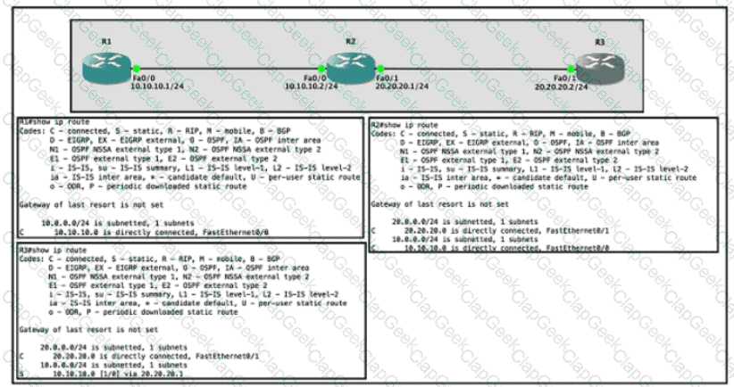 A network engineer is updating the configuration on router R1 to connect a new branch office to the company network R2 has been configured correctly. Which command must the engineer configure so that devices at the new site communicate with the main office?