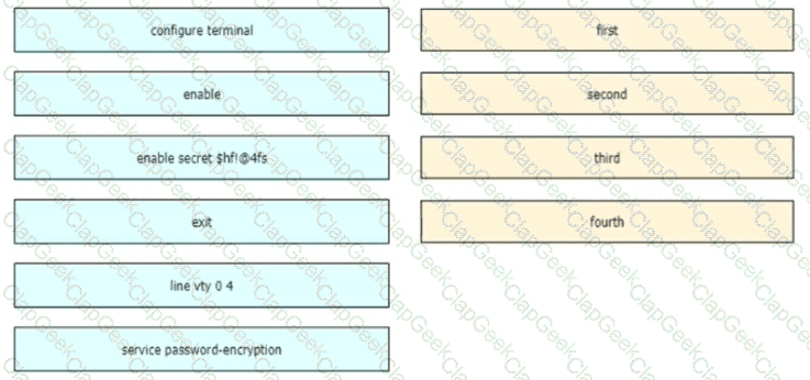 An engineer is configuring an encrypted password for the enable command on a router where the local user database has already been configured Drag and drop the configuration commands from the left into the correct sequence on the right Not all commands are used