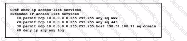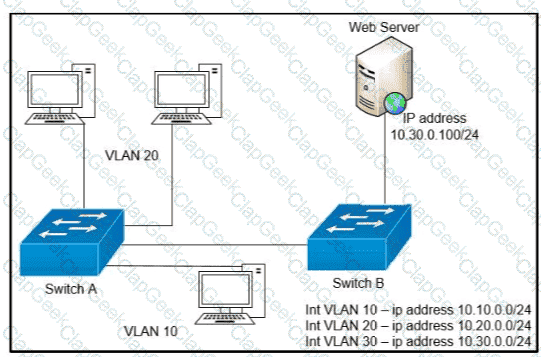 A network engineer must block access for all computers on VLAN 20 to the web server via HTTP All other computers must be able to access the web server Which configuration when applied to switch A accomplishes this task?