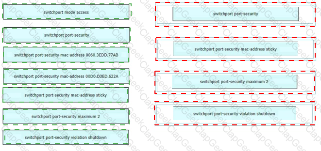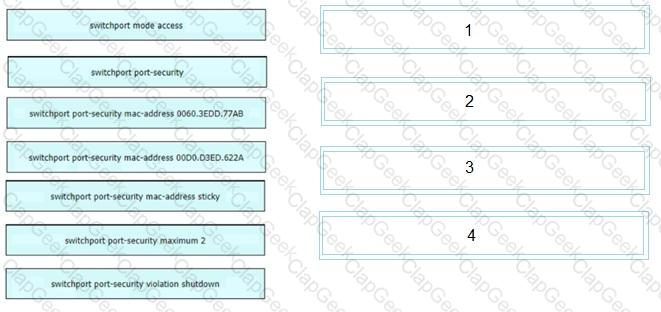An engineer is tasked to configure a switch with port security to ensure devices that forward unicasts multicasts and broadcasts are unable to flood the port The port must be configured to permit only two random MAC addresses at a time Drag and drop the required configuration commands from the left onto the sequence on the right Not all commands are used.