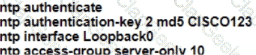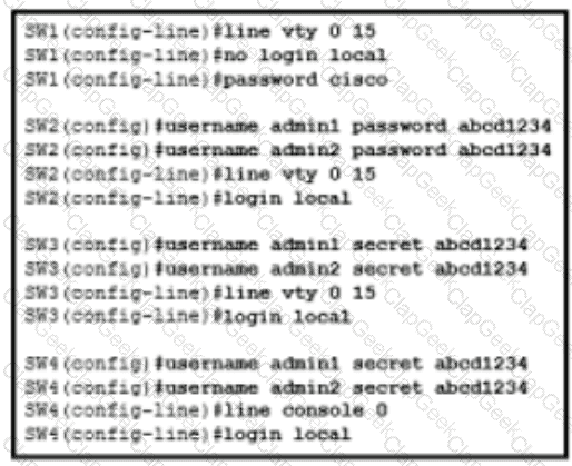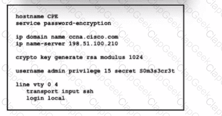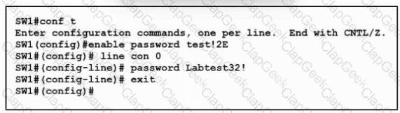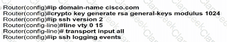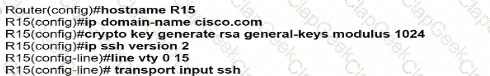 Refer to the exhibit. A VTY password has been set to Labtest32! for remote access. Which commands are required to allow only SSH access and to hide passwords in the running configuration?