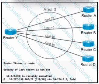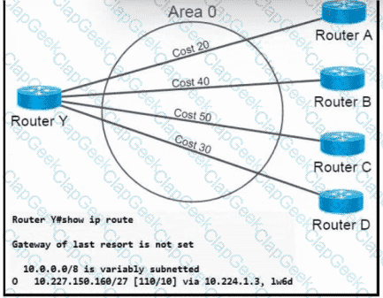 Refer to the exhibit. OSPF neighbors routers A, B, C, and D are sending a route for 10.227.150.160/27. When the current route for 10.227.150.160/27 becomes unavailable, which cost will router Y use to route traffic to 10.227.150.160/27?