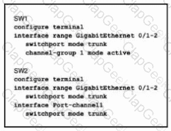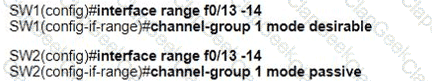 Which command must be configured on switch SW2’s Gi0/1-2 interfaces to establish the channel to SW1?