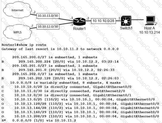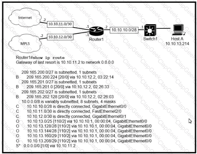An engineer is bringing up a new circuit to the MPLS provider on the Gi0/1 interface of Router1 The new circuit uses eBGP and teams the route to VLAN25 from the BGP path What s the expected behavior for the traffic flow for route 10.10.13.0/25?