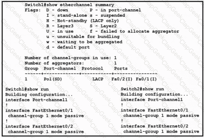 An engineer built a new L2 LACP EtherChannel between SW1 and SW2 and executed these show commands to verify the work. Which additional task allows the two switches to establish an LACP port channel?