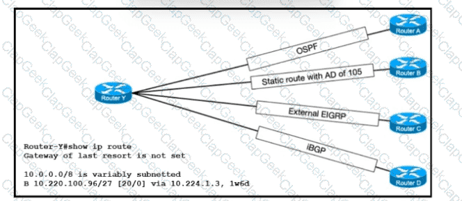 Refer to the exhibit. The route for 10.220.100.96/27 has been very unstable. The same route has four backups to routers A, B, C, and D via the respective methods. The routing protocol defaults for router Y have not been changed. When the current route for 10.220.100.96/27 becomes unavailable, which router will router Y use to route traffic to 10.220.100.96/27?
