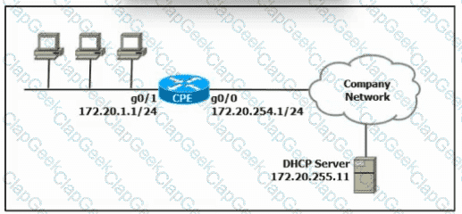 Refer to the exhibit. A network engineer must configure the CPE router to allow computers in the 172.20.1.0/24 network to obtain their IP configurations from the central DHCP server. Which configuration must the engineer apply to the CPE?