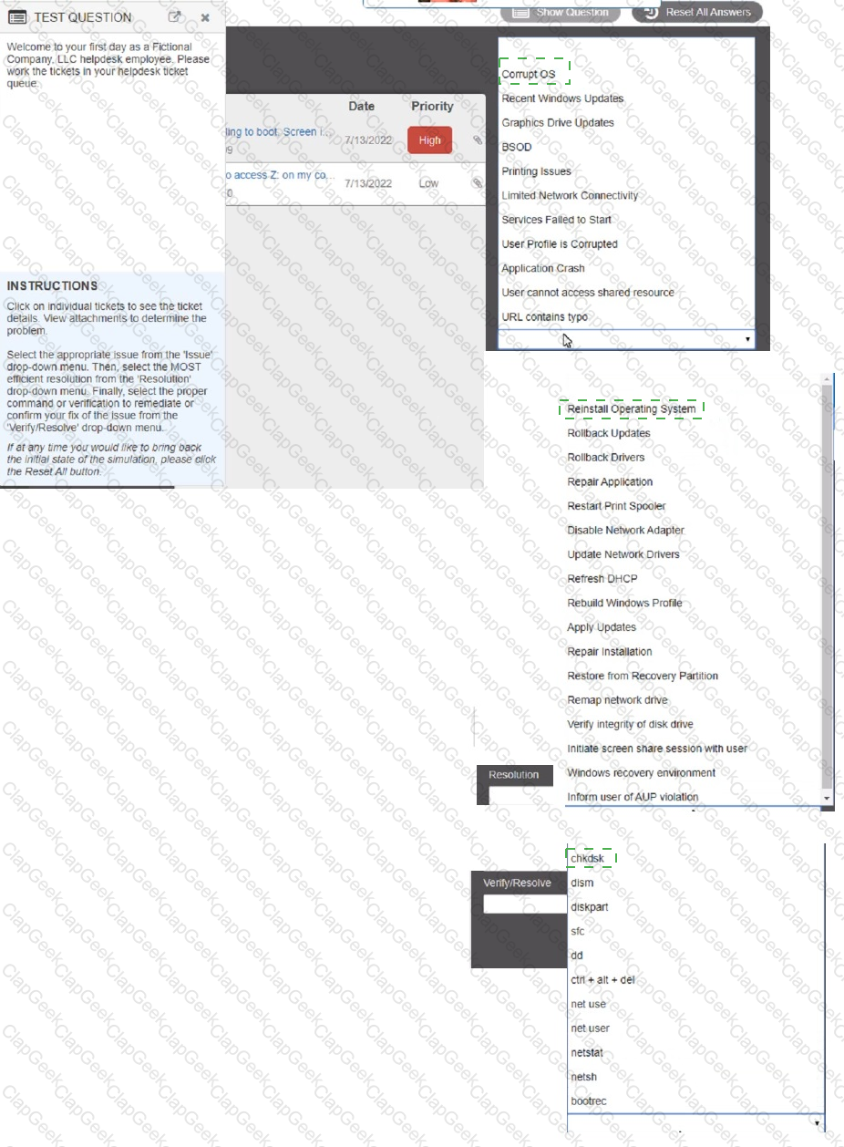 Select the appropriate issue from the 'issue' drop-down menu. Then, select the MOST efficient resolution from the 'Resolution' drop-down menu. Finally, select the proper command or verification to remediate or confirm your fix of the issue from the Verify Resolve drop-down menu.