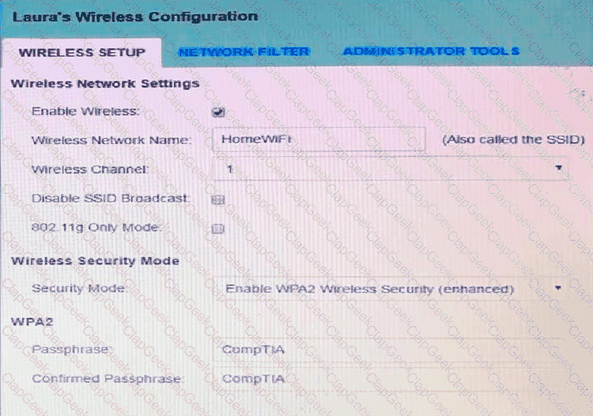 Laura, a customer, has instructed you to configure her home office wireless access point.