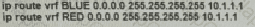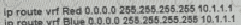 An engineer creates a default static route on a router with a hop of 10.1.1.1. On inspection, the engineer finds the router has two VRFs, Red and Blue. The next hop is valid for both VRFs and exists in each assigned VRF. Which configuration achieves connectivity?