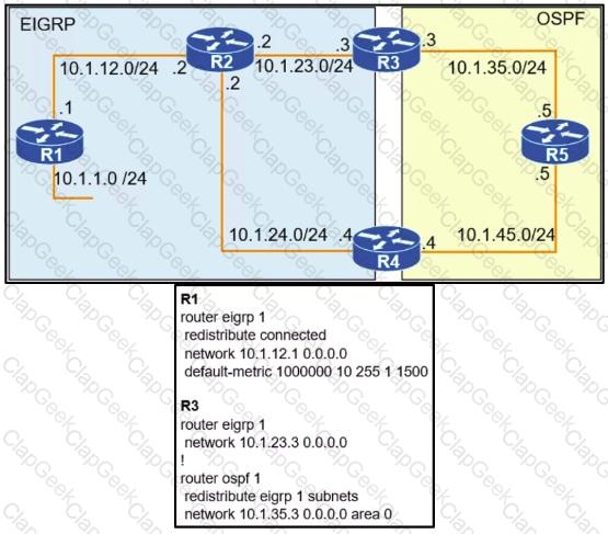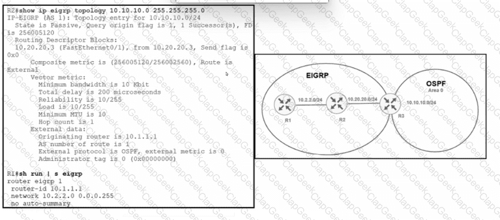 Refer to the exhibit. An engineer configured router R3 to redistribute the prefix 10.10.10.0/24 from OSPF into EIGRP R1 has no connectivity to the prefix. Which action enables receipt of prefixes on R1?