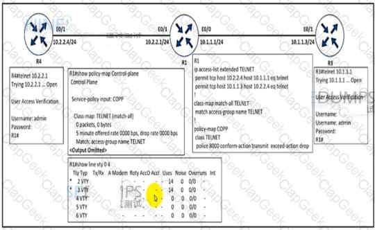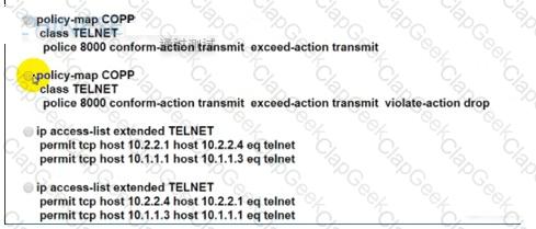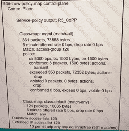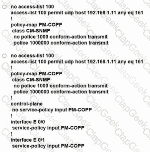 The network administrator configured CoPP so that all SNMP traffic from Cisco Prime located at 192.168.1.11 toward the router CPU is limited to 1000 kbps. Any traffic that exceeds this limit must be dropped.
