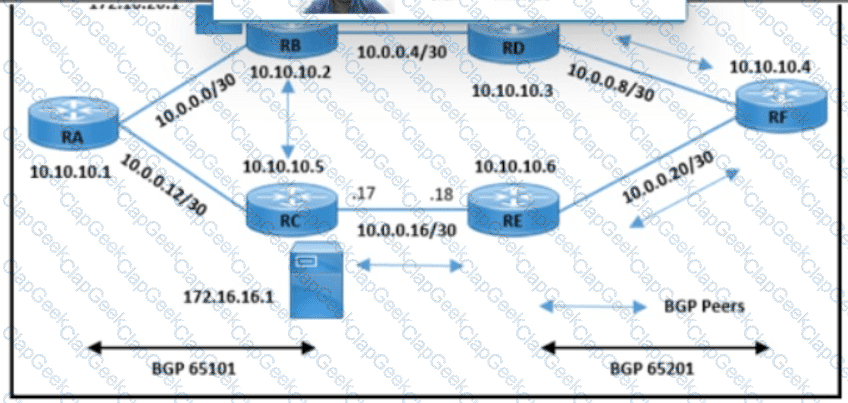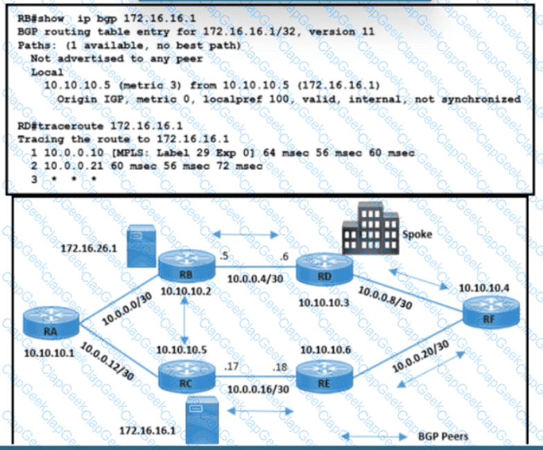 Refer to the exhibit A customer reported an issue with a fiber link failure between RC and RE Users connected through the spoke location face disconnection and packet drops with the primary email server (172.16.16.1) but have no issues with the backup email server (172.16.26.1). All the router loopback IPs are advertised through the OSPF protocol. Which configuration resolves the issue?