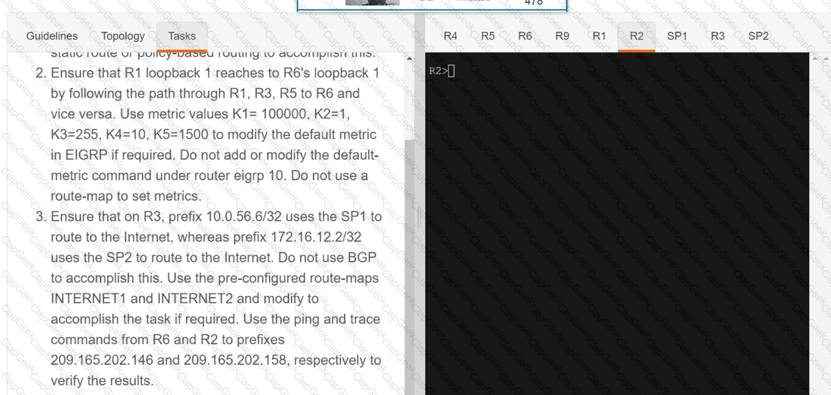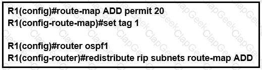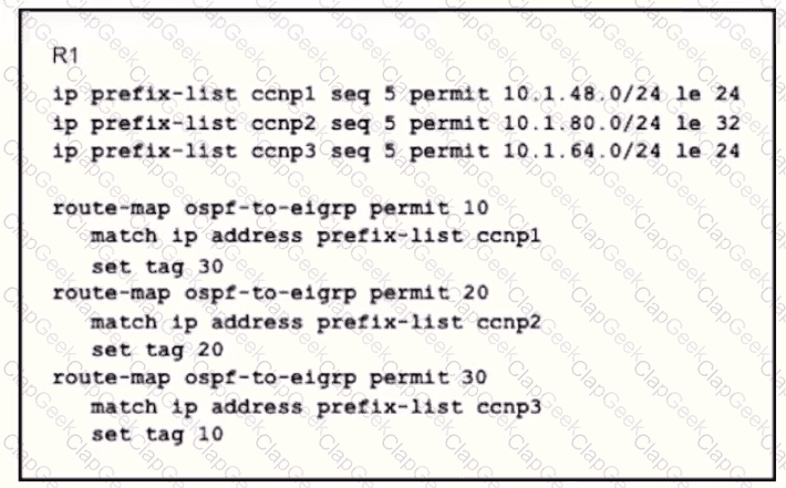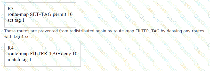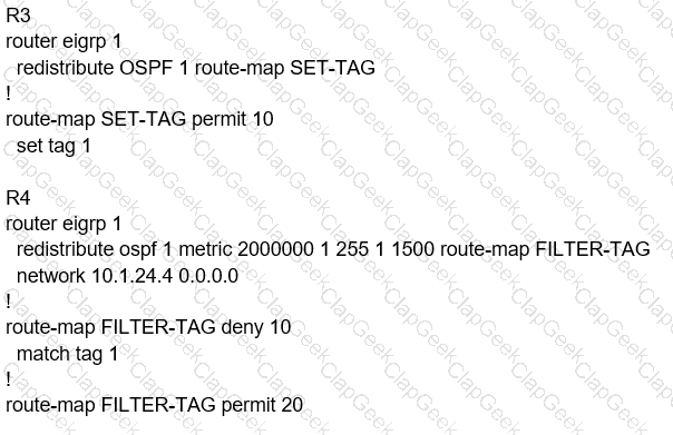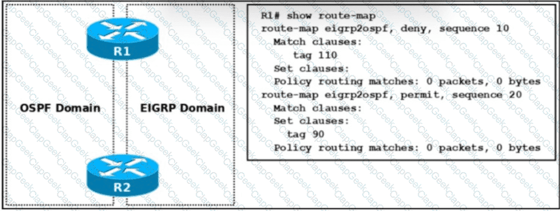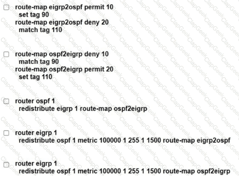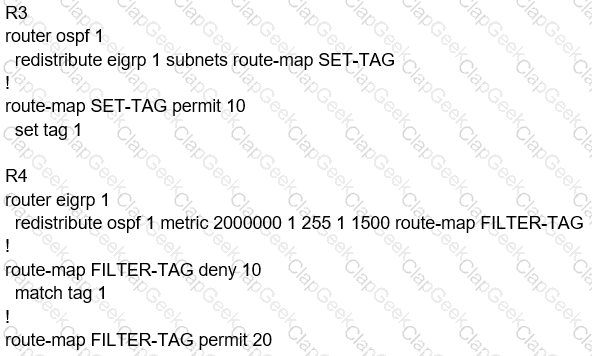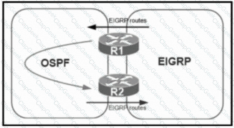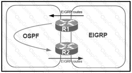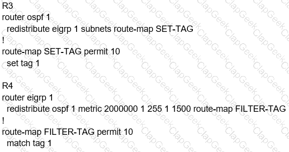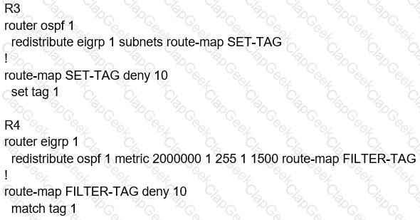 Refer to the exhibit. Which two configurations are required on R2 to prevent a routing loop caused by the redistribution from OSPF back into EIGRP? (Choose two.)