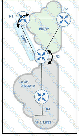 BGP and EIGRP are mutually redistributed on R3, and EIGRP and OSPF are mutually redistributed on R1. Users report packet loss and interruption of service to applications hosted onthe 10.1.1.0724 prefix. An engineer tested the link from R3 to R4 with no packet loss present but has noticed frequent routing changes on R3 when running the debug ip route command. Which action stabilizes the service?
