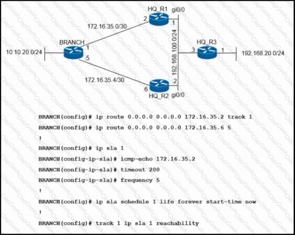 Refer to the exhibit. An engineer has successfully set up a floating static route from the BRANCH router to the HQ network using HQ_R1 as the primary default gateway When the g0/0 goes down on HQ_R1, the branch network cannot reach the HQ network 192.168.20.0/24. Which set of configurations resolves the issue?