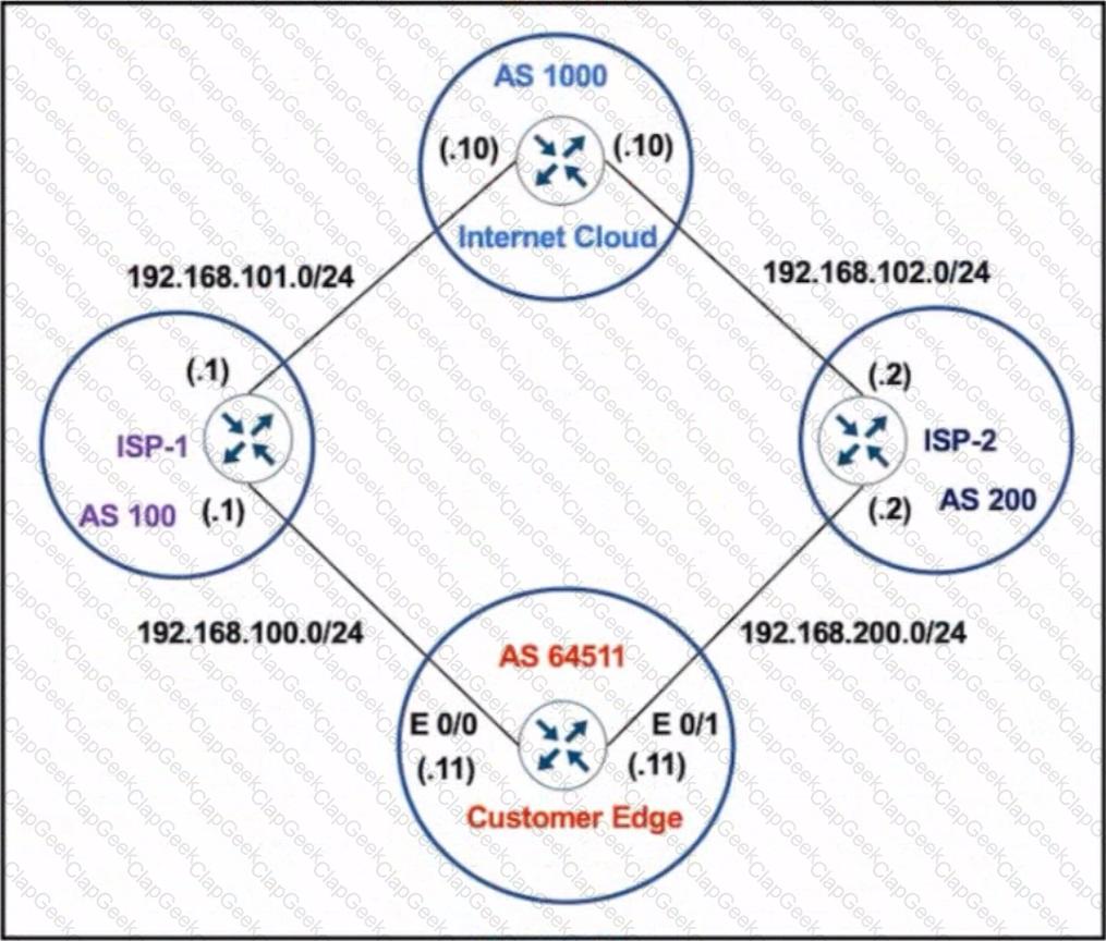 Refer to the exhibit. The network administrator has configured the Customer Edge router (AS 64511) to send only summarized routes toward ISP-1 (AS 100) and ISP-2 (AS 200).