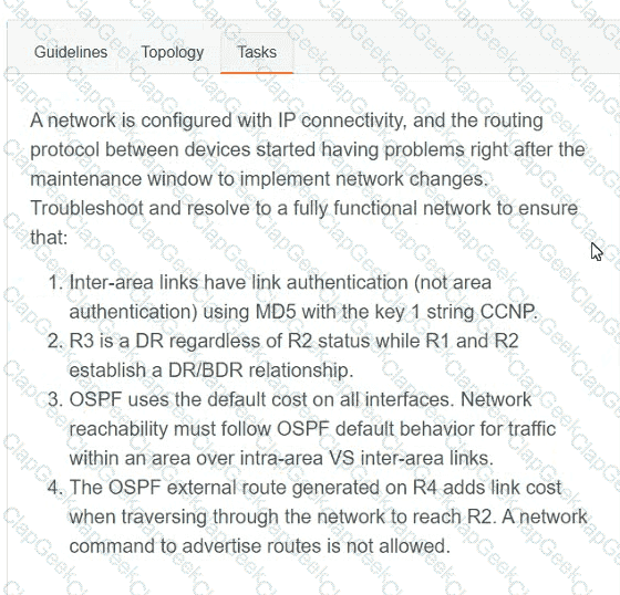 A network is configured with IP connectivity, and the routing protocol between devices started having problems right after the maintenance window to implement network changes. Troubleshoot and resolve to a fully functional network to ensure that: