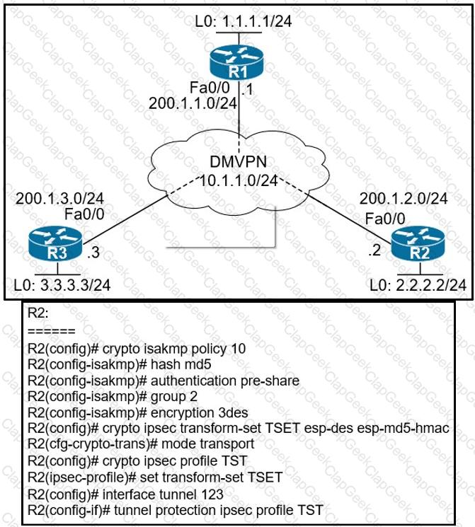 Refer to the exhibit The remote branch locations have a static neighbor relationship configured to R1 only R1 has successful neighbor relationships with the remote locations of R2 and R3, but the end users cannot communicate with each other. Which configuration resolves the issue’